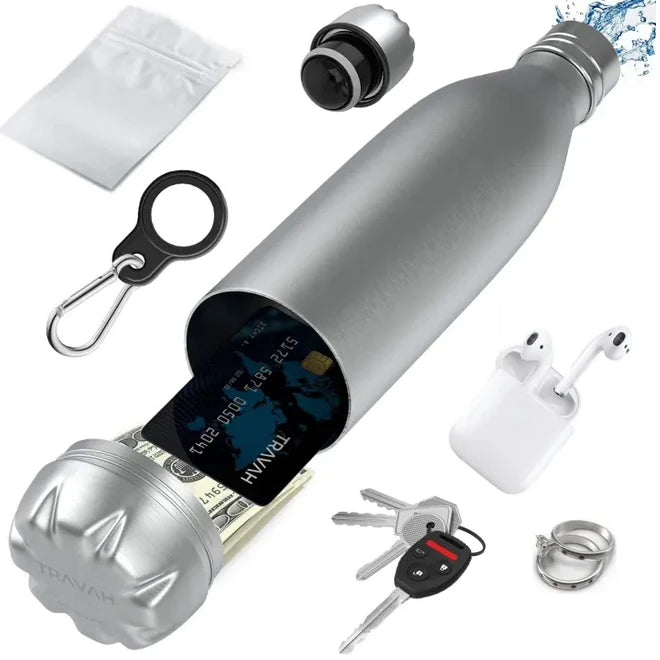 The Secret Hidden Safe Steel Water Bottle is the ultimate blend of functionality and security. On the outside, it's an attractive, high-quality water bottle that keeps your beverages at the perfect temperature. On the inside, it boasts a secret compartment that's perfect for safeguarding your valuables, such as keys, cash, or small essentials.